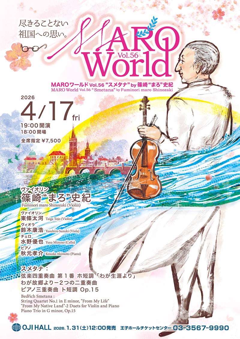 篠崎“まろ”史紀(ヴァイオリン) 北九州市出身。愛称“まろ”。3歳より両親の手ほどきを受け、1981年ウィーン市立音楽院に入学。翌年コンツェルト・ハウスでコンサート・デビューを飾る。その後ヨーロッパの主要なコンクールで数々の受賞を果たし、ヨーロッパを中心にソロ、室内楽と幅広く活動。88年帰国後、群響、読響のコンサートマスターを経て、97年N響のコンサートマスターに就任。“N響の顔”として国内外で活躍し、2025年3月、惜しまれながら退団した。96年に東京ジュニアオーケストラを立ち上げ、以来後進の育成に力を注いでいる。04年より王子ホールでスタートしたシリーズ『MAROワールド』から弦楽合奏団「MAROカンパニー」が結成され、これらの功績により、「2020年度 第33回 ミュージック・ペンクラブ音楽賞」受賞。その他、79年史上最年少で北九州市民文化賞、01年福岡県文化賞、14年有馬賞受賞。現在、WHO国際医学アカデミー・ライフハーモニーサイエンス評議会議員、北九州文化大使、九州交響楽団ミュージック・アドバイザー、リーデンローズ音楽大使、一般社団法人Music Force理事長。絵本「おんがくはまほう」(リトルモア)、エッセイ「音楽が人智を超える瞬間」(ポプラ社)が刊行されるなど、多方面で活躍している。 |