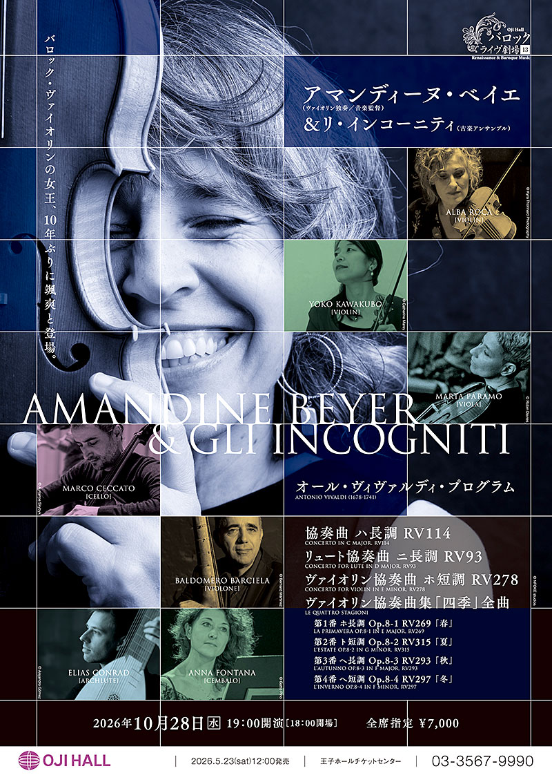 バロック・ヴァイオリンの女王アマンディーヌ・ベイエ率いるリ・インコーニティが、10年ぶりに“四季”と共にやって来ます。颯爽とした弾きぶりで聴衆を惹きつけ、わくわくさせるヴィヴァルディの世界を《バロック・ライヴ劇場》で再び。