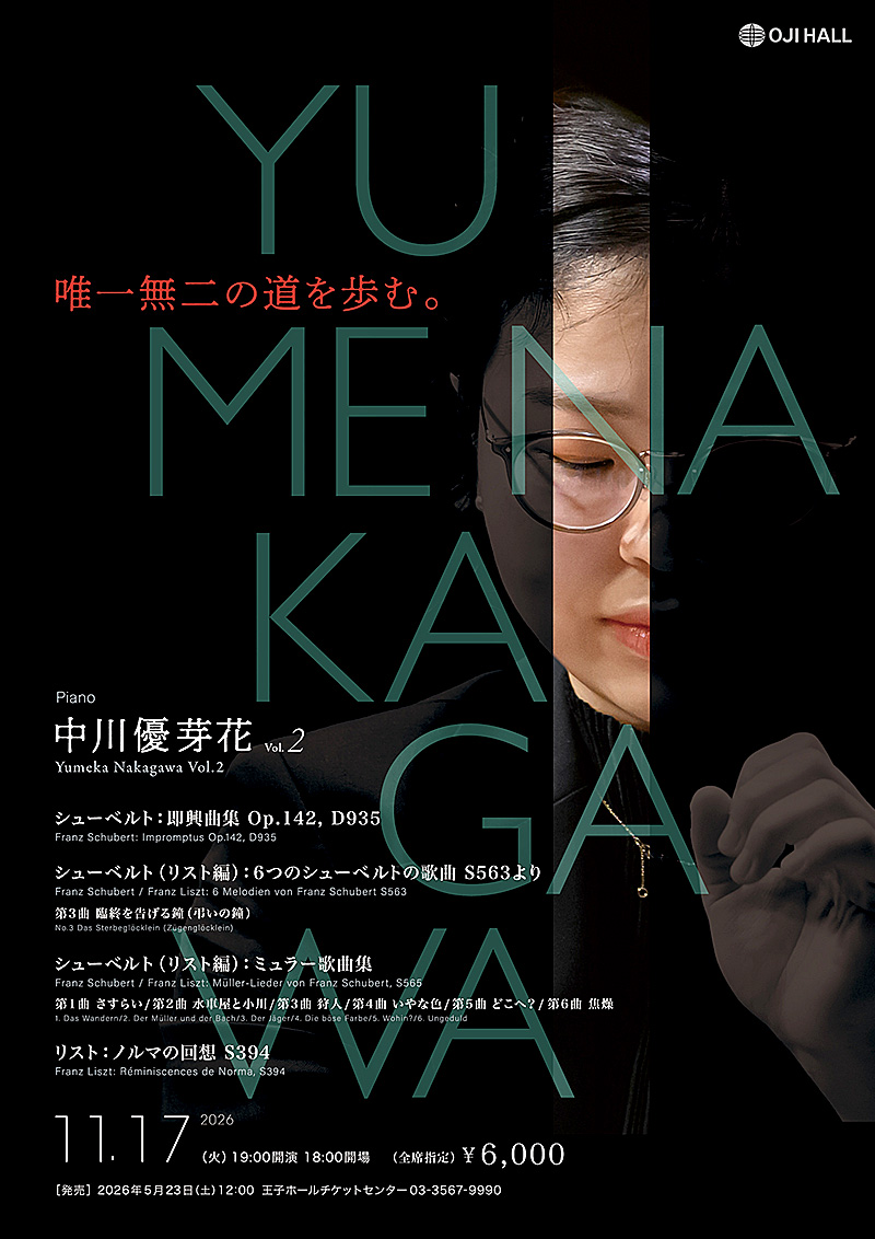 中川優芽花(ピアノ) ドイツに生まれ育った日本人ピアニスト。2021年、クララ・ハスキル国際ピアノ・コンクールで優勝、および聴衆賞ほかもあわせて受賞。デュッセルドルフで開催されたロベルト・シューマン国際コンクール(2019)、およびイェネー・タカーチ国際コンクール(2018)でも優勝している。14年にワイマールで開催された「若いピアニストのためのフランツ・リスト国際コンクール」では第2位に入賞。19年以降ロンドンのウィグモア・ホール、デュッセルドルフのトーンハレ、ワイマールハレ、マリインスキー国際ピアノ・フェスティバルなどで演奏。クリスティアン・ツァハリアス指揮ホーフ交響楽団、ポルト・カーザ・ダ・ムジカ管弦楽団などと共演しているほか、ウィーン・コンツェルトハウス、リンツ・プルックナーハウスでも演奏している。25年6月にはハンブルクのマルタ・アルゲリッチ音楽祭に出演。01年にデュッセルドルフで生まれ、デュッセルドルフのロベルト・シューマン音楽大学にてバーバラ・シュツェパンスカのもと音楽の教育を受け始める。ロンドンのパーセル音楽院ではウィリアム・フォンに学ぶ。21年よりワイマールのフランツ・リスト音楽大学においてグリゴリー・グルズマン教授のもと研鑽を積んでいる。23年にはスイスのグシュタードでマリア・ジョアオ・ピリスのマスタークラスを受講。22年より24年までロームミュージックファンデーションの奨学金を得た。22年3月、クララ・ハスキル国際優勝後初の来日リサイタルは大絶賛を浴び、以後大阪フィル、名古屋フィル、神奈川フィル、東京フィル、読響、兵庫芸術文化センター管、大阪響、都響、アンサンブル金沢といった国内の主要なオーケストラと共演を重ね、行く先々で絶賛されている。25年には岩谷時子 Foundation for Youthを受賞。 |
