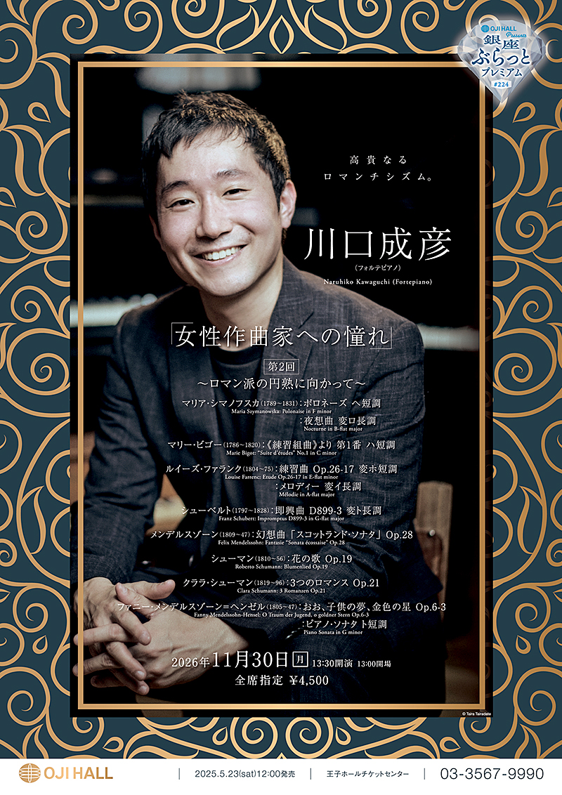 平日の昼下がり、銀座でのお買い物のついでに、お友達との銀ぶらの途中に立ち寄れる気軽なコンサート、『銀座ぶらっとプレミアム』第224回。計り知れない才能と探求心を持つ鍵盤奏者・川口成彦が、毎回楽器を変えておおくりするシリーズ「女性作曲家への憧れ」の2回目。時代はロマン派の円熟期を迎えます。